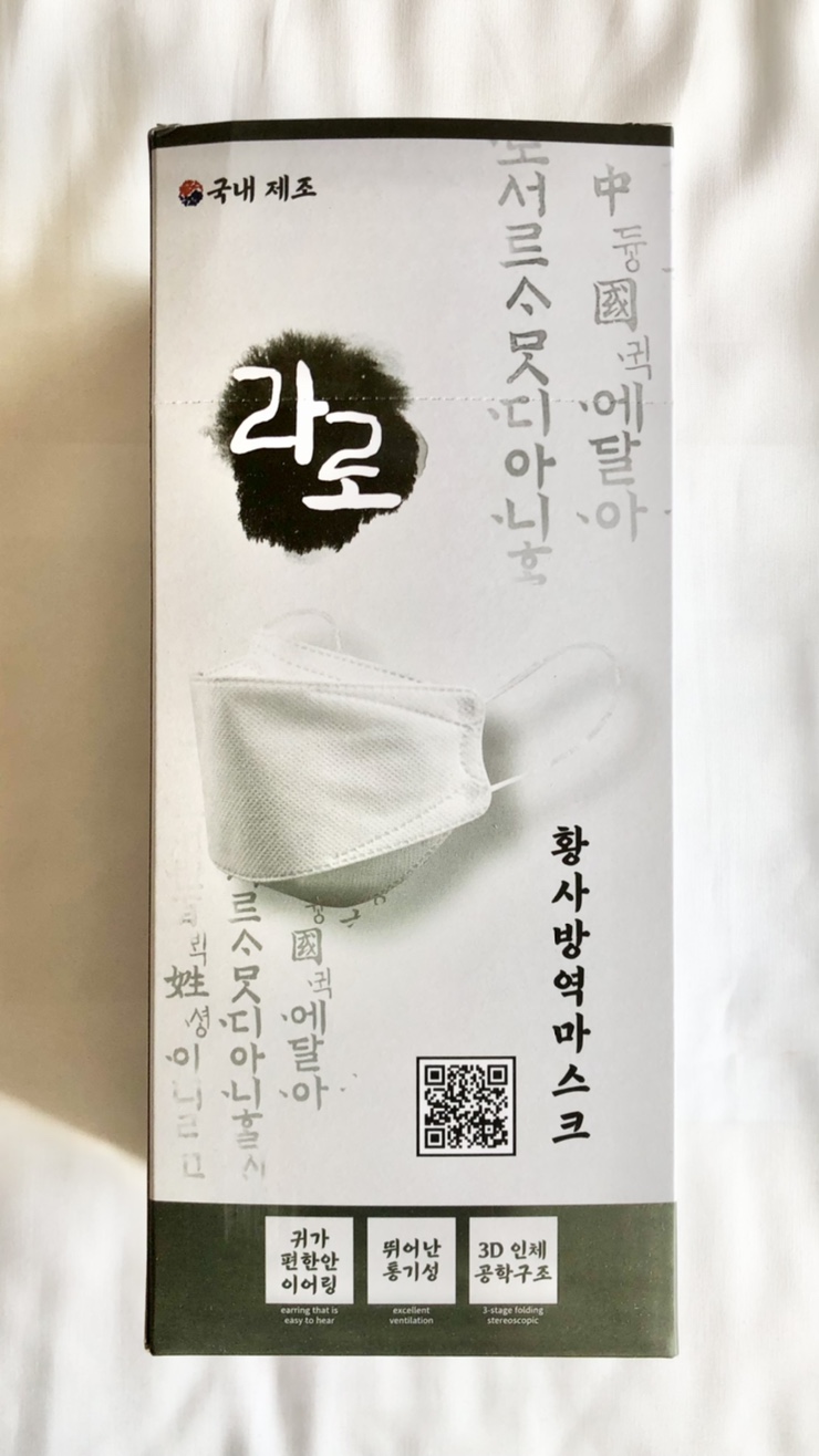 | 품명 및 모델명 | 라로 패션 인쇄 마스크 | 인증/허가 사항 | KF94 식약청 인증 마스크, 단 인쇄(2차 공정)로 인한 공산품 취급 | ||||